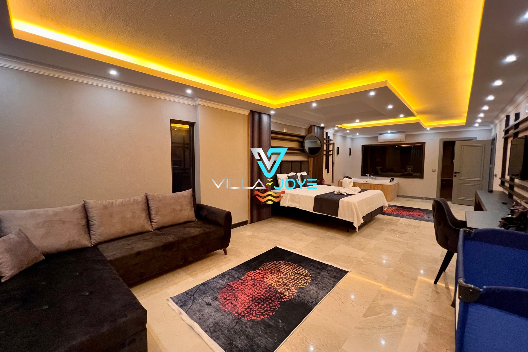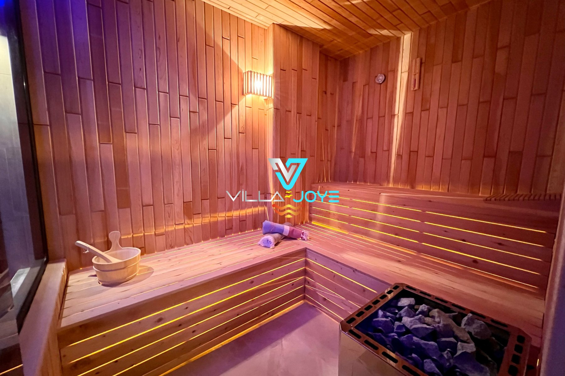 Evimizin tüm odalarında klima ve WC+banyo, 1 odasında da jakuzi bulunur. Salonumuzda da TV, klima, hamam, sauna ve langırt bulunmaktadır.