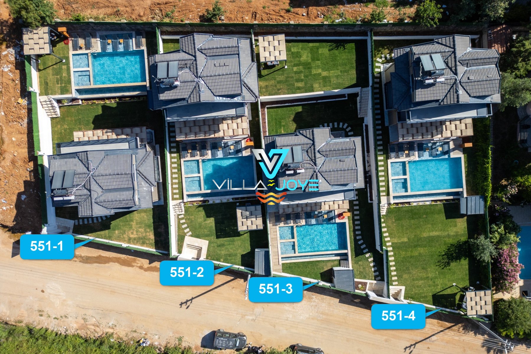 551-1, 551-2, 551-3 ve 551-4 Nolu tatil evlerimiz aynı konumda bulunan, havuzları ve bahçeleri birbirinden bağımsız evlerimizdendir. Daha kalabalık aileler / arkadaş grupları daha fazla evimizi beraber kiralayarak da konaklayabilirler.